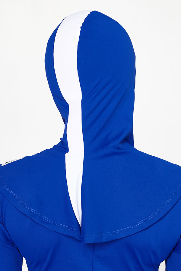 قبعة السباحة زرقاء اللون مع شريط ابيض اللون.