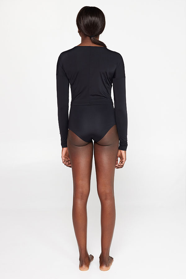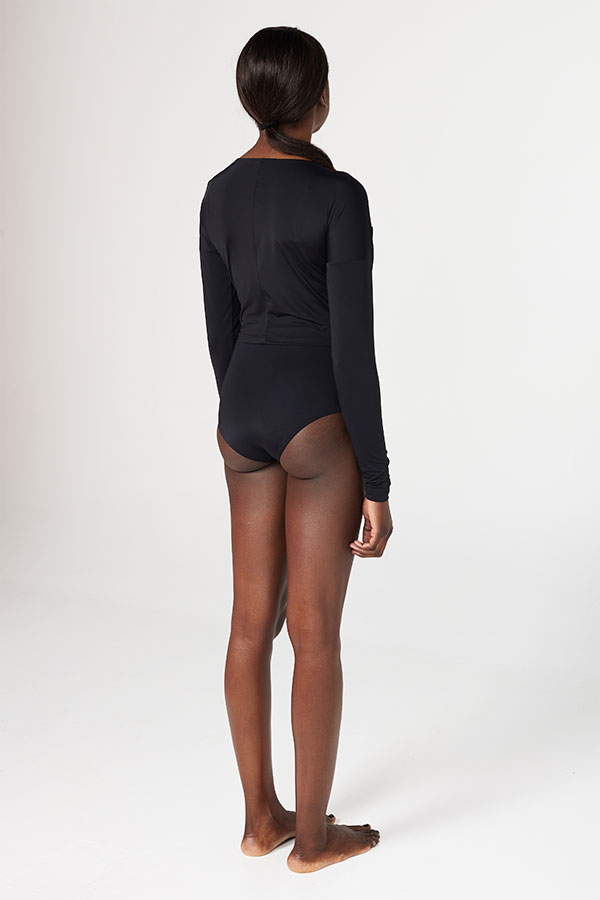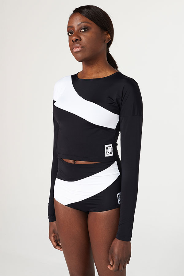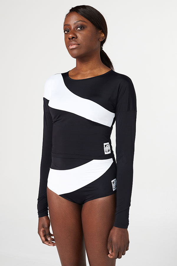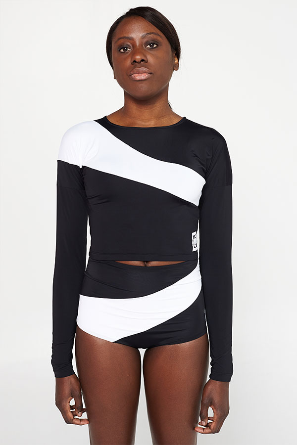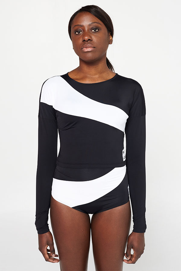 بدلة لركوب الامواج كم طويل سوداء, خصر عالى ,شرائط متداخلة الالوان.